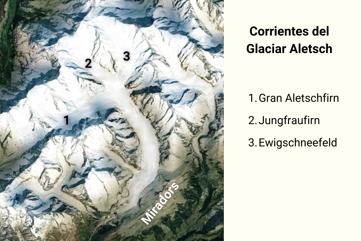 Este gran glaciar se divide en tres ramas, tres grandes flujos de corriente que convergen para gestar esta gran formación geológica. Al oeste, saliendo de los pies del Aletschorn y el Dreieckhorn está el Gran Aletschfirn; al noroeste, saliendo de los pies del Jungfrau y el Mönch, el Jungfraufirn; y al norte, entre el Trugberg y el Gross Fiescherhorn, el Ewigschneefeld. Pero la parte más visible desde los miradores es la unión que forman estas tres ramas.
